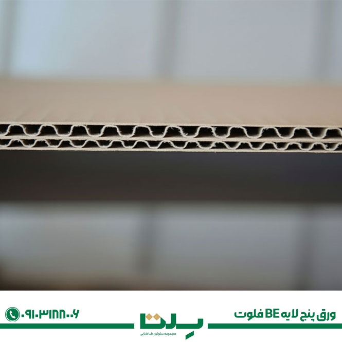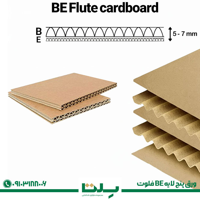 ورق پنج لایه BE فلوت از ترکیب سه لایه کاغذ صاف و دو لایه کاغذ کنگرهای (فلوت B و فلوتE ) تشکیل میشود که به صورت متوالی چسبانده شدهاند. تراکم کنگرههای B فلوت بین ۱۲۵ الی ۱۵۰ عدد و کنگرههای E فلوت بین ۲۹۰ تا ۳۲۰ عدد در هر متر میباشد. این ساختار منحصربهفرد، ترکیبی از استحکام فلوت B و ظرافت فلوت E را ارائه میدهد که آن را به یکی از مقاومترین و پرکاربردترین ورقهای بستهبندی تبدیل میکند.