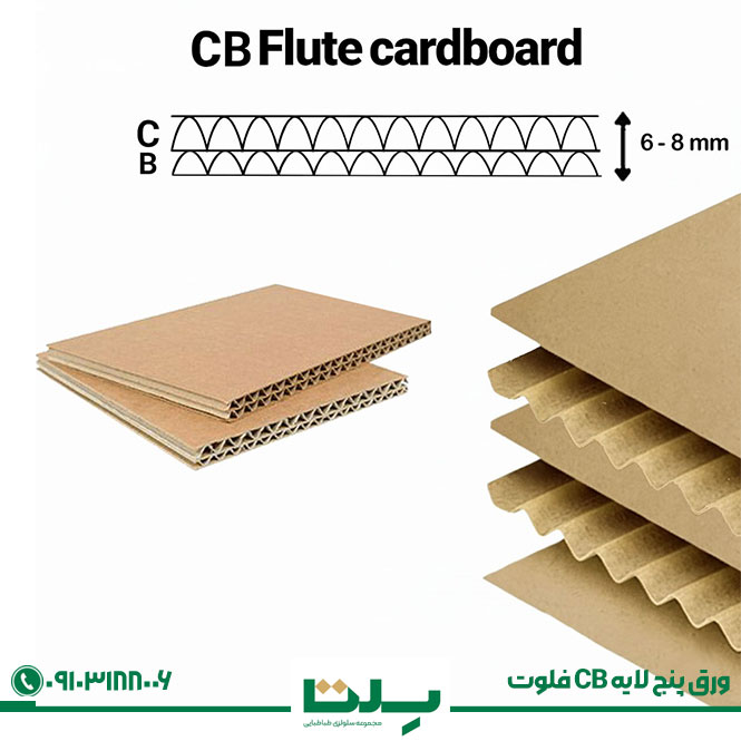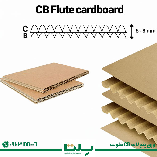 ورق پنج لایه CB فلوت از ترکیب سه لایه کاغذ صاف و دو لایه کاغذ کنگرهای (فلوت C و فلوتB ) تشکیل میشود که به صورت متوالی چسبانده شدهاند. تراکم کنگرههای C فلوت بین 120 الی 145 عدد و کنگرههای B فلوت بین ۱۲۵ الی ۱۵۰ عدد در هر متر میباشد. این ساختار منحصربهفرد، ترکیبی از استحکام فلوتهای C و B را ارائه میدهد که آن را به یکی از مقاومترین و محکمترین ورقهای بستهبندی تبدیل میکند.